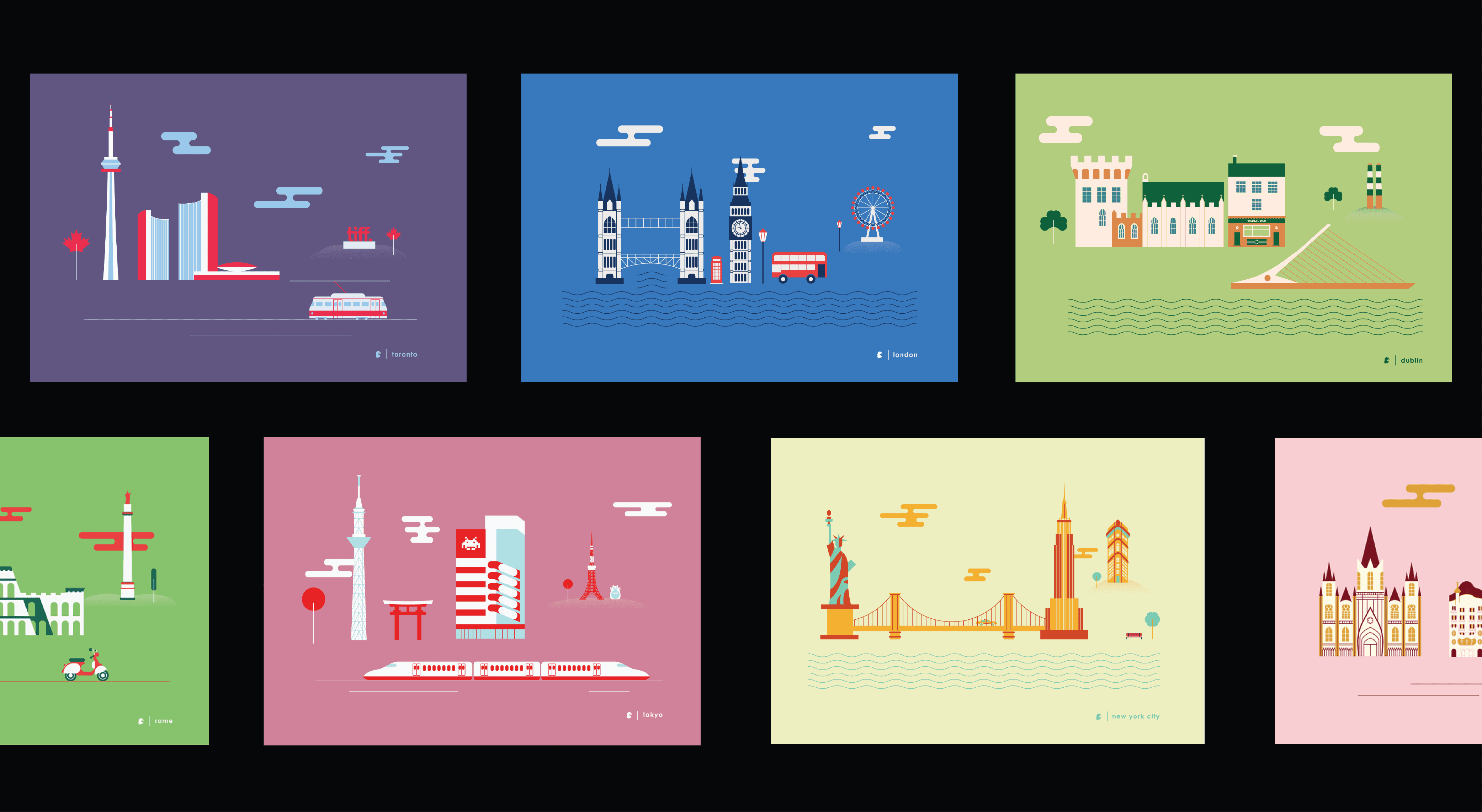 For Paper Republic, a literary lifestyle brand, I illustrated a series of cityscapes for a piece about famous literary cities. The challenge was to capture each location's vibe using just a few landmarks and a limited colour palette. Trying to capture Paris or Dublin in three colours and a handful of shapes was a fun challenege and I'm chuffed with the results because, in my (not at all bias eyes) each one does feel recognisable.